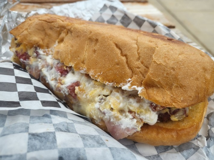 Starting with the fresh and buttery grilled bolillo roll, it's piled to the toasted top with scrambled eggs, bacon strips, ham chunks, multiple cheeses, and, of course, mayo.