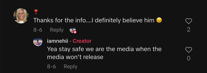 I’m not sure if they’re from real people – or simply overseas bots trying to rig the algorithm and promote false rumors – but Nehemiah was quick to interact, and it shows how quick and easy lies and misinformation can spread: