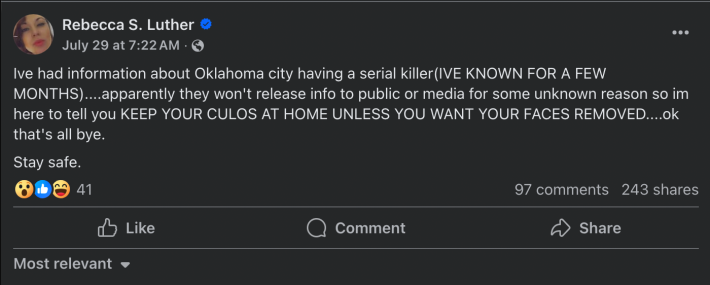 @neonshoebox I see all of your comments. Glad the community is coming together let’s all stay VIGILANT AND protect each other. We can not let this turn into “the butcher” type of thing. #sk #serialkiller #oklahoma