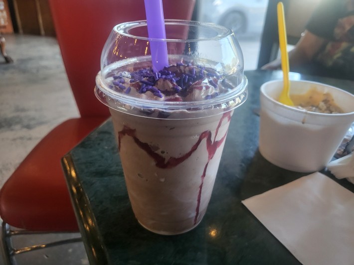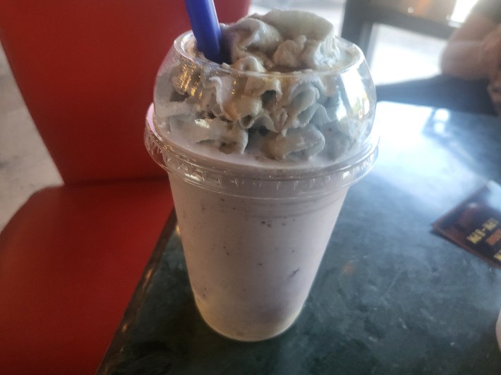 As we took our shakes to the car, I turned the key and took a sip from the Addams Family’s inspired novelty, the Wednesday Addams ($7.50). My wife, on the other hand, took a swallow of the Stranger Things-based shake, The Upside Down ($7.50).