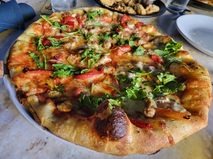 I decided on the spicy Saucy Sausage ($16.00), a reasonable 13-inch pie with house-made marinara and shredded mozzarella cheese, topped with the somewhat spicy sausage, roasted red pepper, and a few sprigs of arugula.