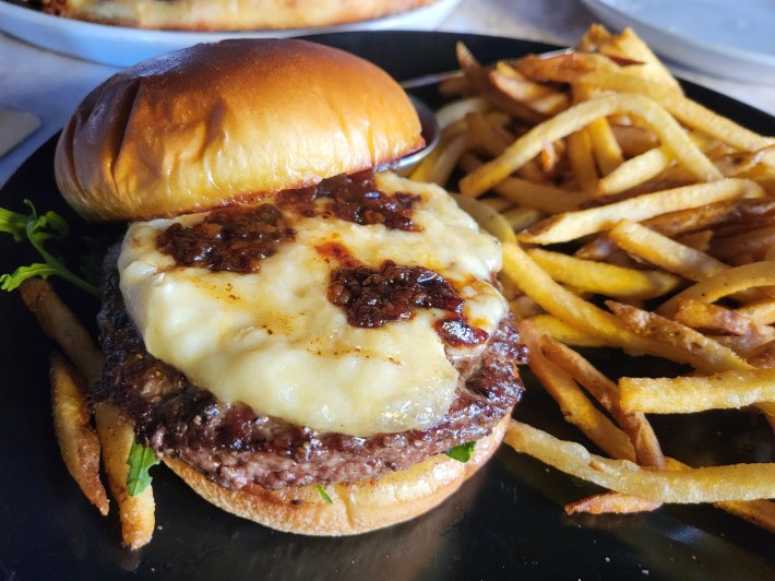 But my wife—quite the Francophile—had to stop the artichoke attack for her entrée, the fabulous Brie Burger ($18.00). It was a 100% Angus burger, laden with melted brie, arugula and a truly decadent bacon jam, served with seasoned house-cut fries.