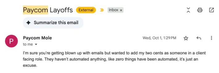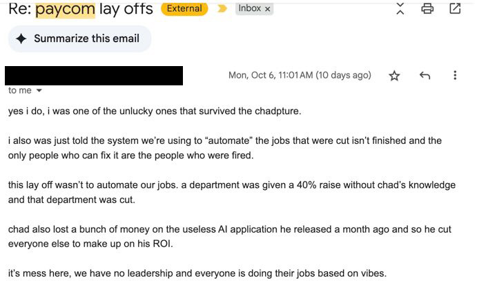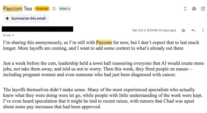Yep, THIS. WILL. KEEP. HAPPENING. And by “this,” I’m referring to A) corporations blaming layoffs on AI and B) Paycom’s ongoing employee purge.