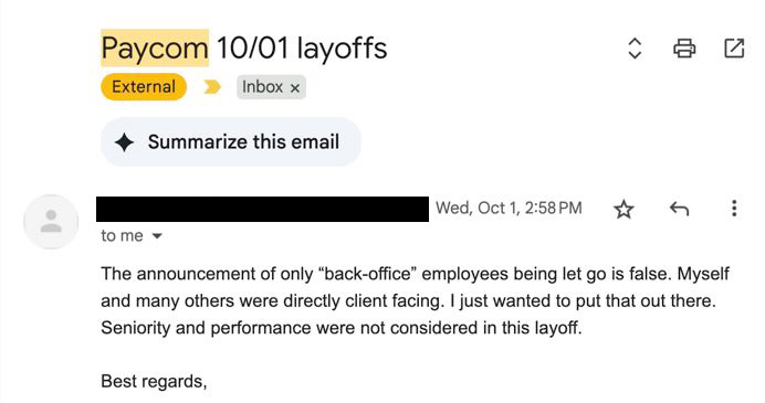 This time around, we’ve once again had multiple Paycom Moles – many of whom are violating confidentiality agreements – reach out over the past few weeks to dispute Paycom’s excuse that this layoff is AI-driven.