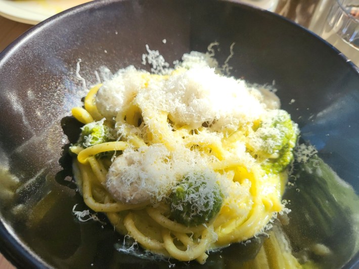 And while I could have that toast for breakfast, lunch and dinner, we settled back to reality and got our main dishes from the “Pasta” side of the newspaper-printed menu, starting with my wife’s Bucatini ($19.00), a steadfast pasta with basil cream, pesto ribbons, and whipped burrata.