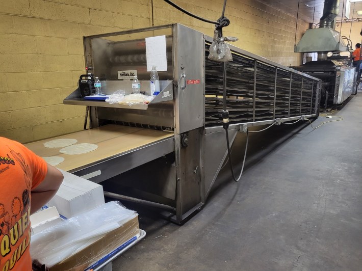 Walking past the “employees only” sign, three women in hairnets were using the industrial tortilla press, kneading the dough and stretching it out to an acceptable length. Then they were cooked on a conveyor belt that looked like a Mexican adaptation of Willy Wonka… Guillermo Wonka?