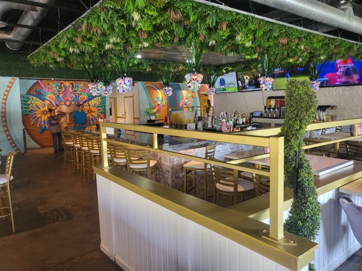 As soon as we walked in, the host met us at the door and took us swiftly to our table, past the bunches of iconic Catrina skulls along the bar, next to the oddly shaped shrubs around us, and right by a grand mural of their minuscule winged mascot taking flight—something I felt drawn to.