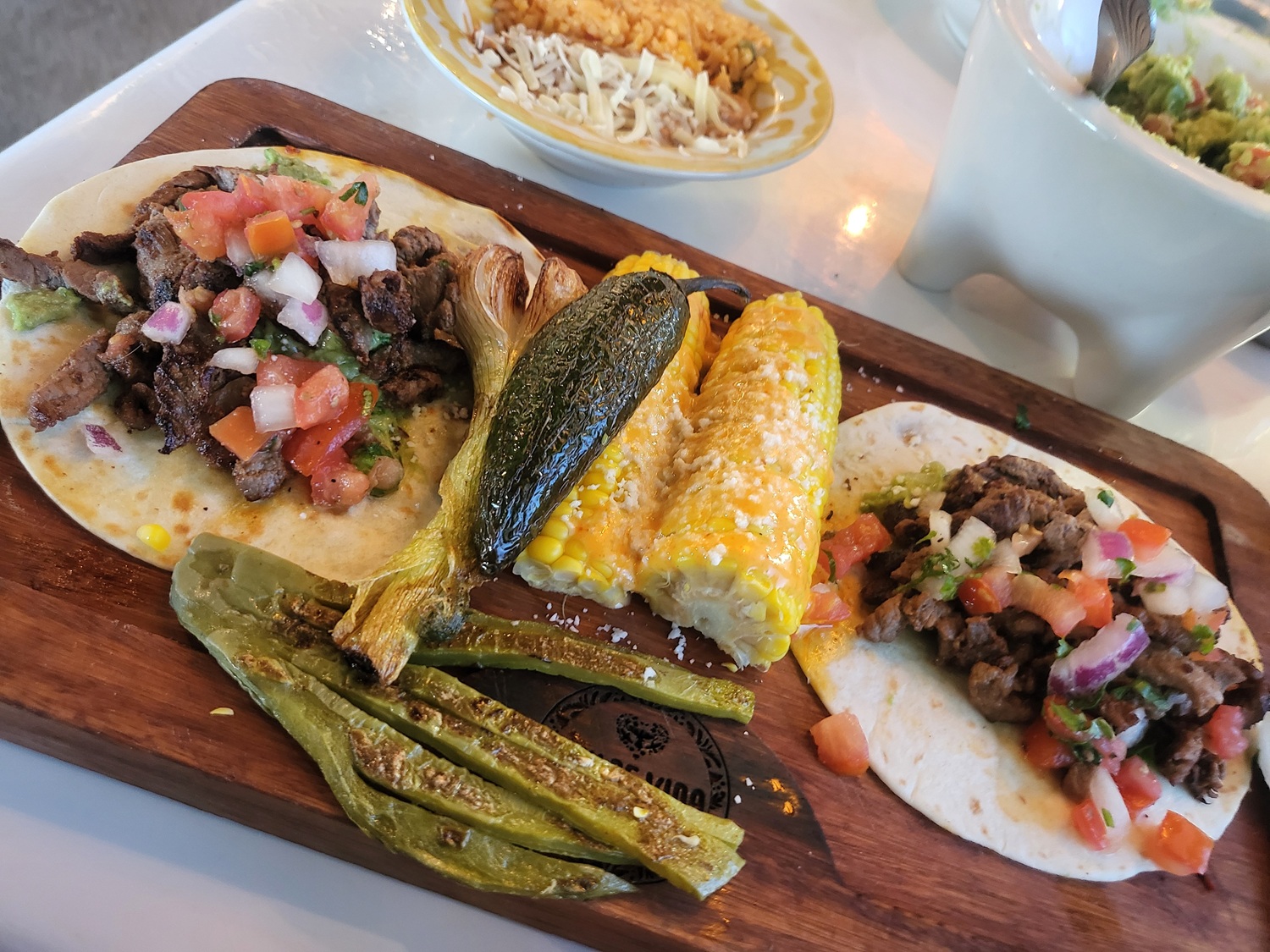 Specifically, I ordered the exquisite Cowboy Tacos ($15.99), a way-out-West take, featuring grilled steak topped with guacamole and pico de gallo, as well as a grilled cambray onion, nopales (or, if you prefer, diced cactus), and a pair of sweet corn ribs.