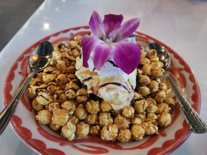 Having finished our lunch, a table nearby had their birthday girl loudly celebrated in song by the staff of the restaurant, and after the applause commenced, she was presented with the Caramel Lava Cake ($7.99) on a plate surrounded with caramel popcorn.