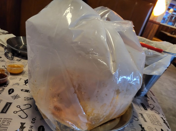Within mere moments, though, we were presented with a steel bucket, complex tools, plastic gloves, and the pièce de résistance, a puffed-up cellophane bag that, though fogged by the steamy contents, meant that something special was going to happen.