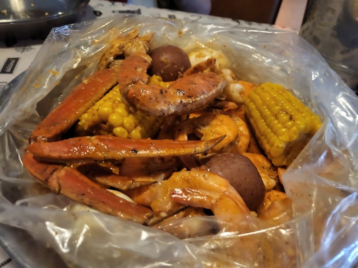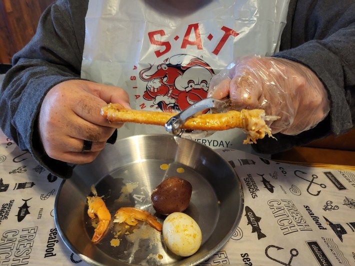 With the crab-inspired bib around my neck, our server slashed open the SAT Combo bag and, as the murky steam rose to a fine watery mist, its beautiful bounty of five snow crab legs, numerous unpeeled shrimp, two potatoes, two ears of corn, and two hard-boiled eggs presented itself to us.