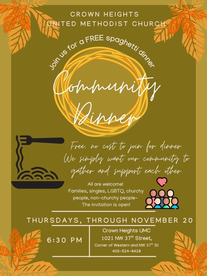 The first place I went was Crown Heights United Methodist Church, 1021 NW 37th, where they are offering a free spaghetti dinner on Thursday nights in November. Provided without cost or regard for church affiliation, people can come and have a pasta dinner with some green beans and fruit punch. Not a glorified steak dinner, but it works…and it’s free.