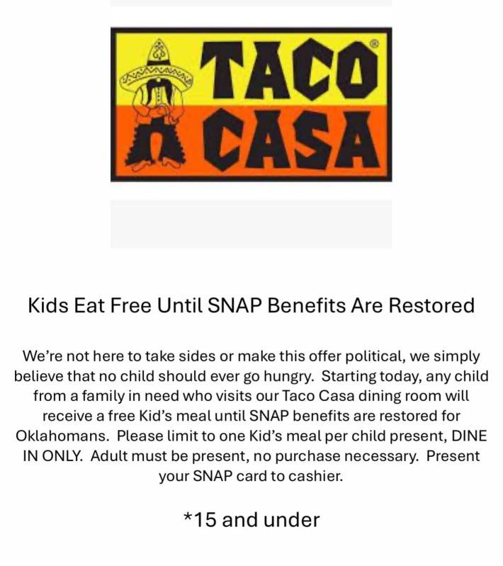 As I was concluding this article, I received an email from Taco Casa – the Texas-based restaurant with two OKC locations (13901 N. Penn and 5225 N. May) that I was set to review with Patrick this month – announcing that all kids’ meals will be free with a parent’s SNAP card until benefits are restored. No purchase necessary.