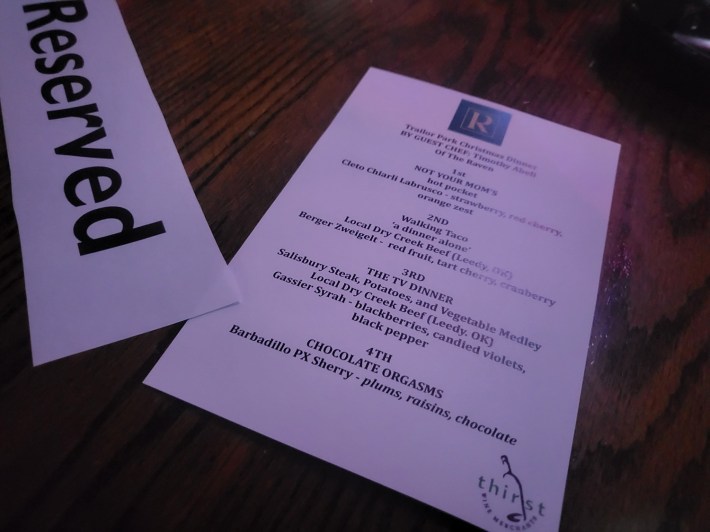 After a brief introduction to tonight's guest chef, Timothy Abell of The Raven, they started the culinary program, where dinner is the show. He said, based on his time in West Virginia, the theme was a “Trailor Park Christmas Dinner.”