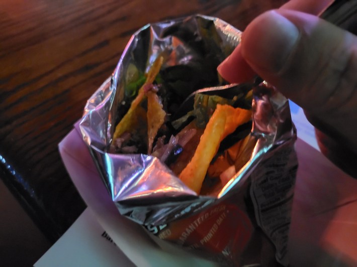 Either way, I kept on keeping on with my second course, a Walking Taco or, as the menu told us, “A Dinner Alone.” I was sure I was all alone on this one, right?