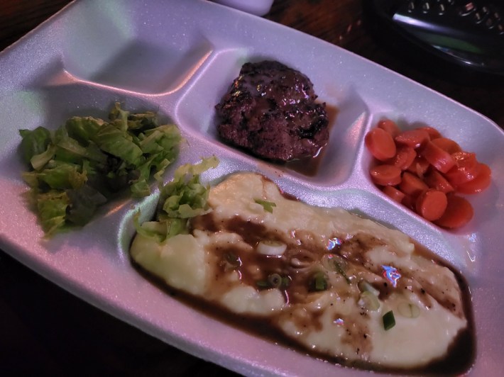Growing up with this style of microwavable meals, it was a real trip to have that simulation with good hearty foods that most people would love to eat. The Salisbury steak with its onion gravy was like no steak I ever had and paired magically with the fluffy potatoes.