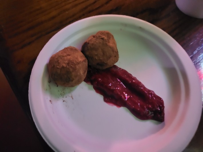 As the dinner was winding down and the room got more boisterous, they brought out the final piece to this edible puzzle, the Chocolate Orgasm. Two bittersweet chocolate balls sat atop a shaft of pure raspberry confit, which rendered these chocolatey balls ready to, appropriately, gobble down.