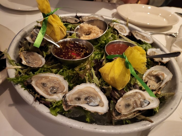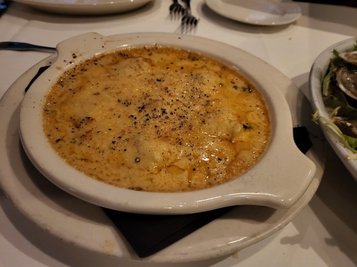 When it came time for the appetizers, I confidently ordered Lobster Cargot for the table. Patrick, thinking that that might be too little for the party of four, also ordered the Fresh Oysters—Blue Point being the selection this fine evening.