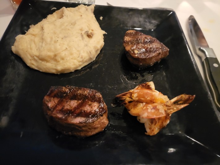 It was part of the Double Play combo that includes a 3 oz. A5+ Japanese Wagyu Filet, a 3 oz. Center-Cut Filet Mignon, Two Grilled Jumbo Shrimp, and, last but not least, Chef’s Featured Potatoes, which on this night were gloriously mashed.