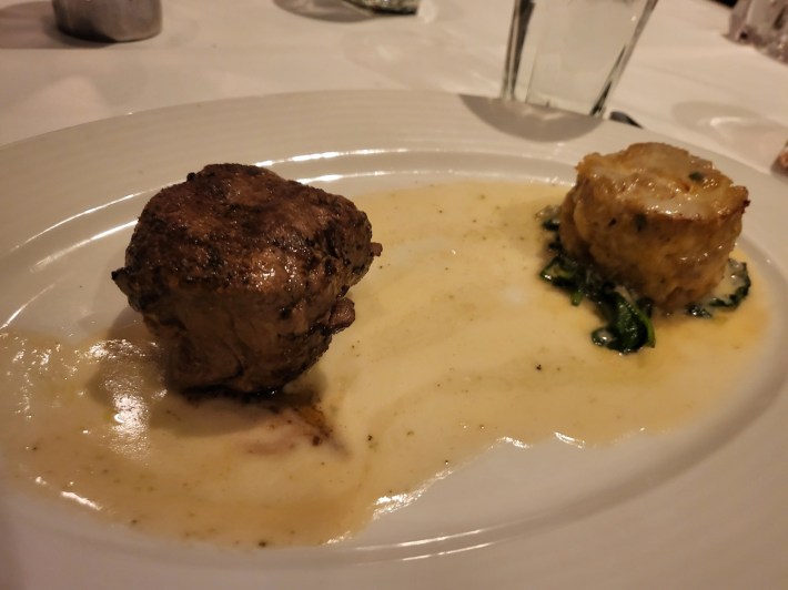 The filet was soft and tender and elicious, just as they should be, while the crab cake brought sweet brine and a delicate crunch, tasting like the ocean showed up polished and well-behaved.
