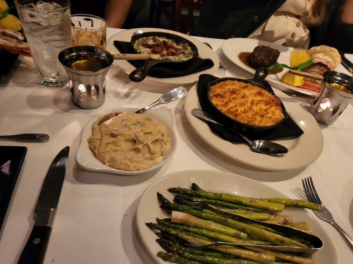 Then there were the family-style sides, lots of them, like potatoes au gratin, grilled asparagus, and, per my wife’s request, creamed spinach, rounding out our order.