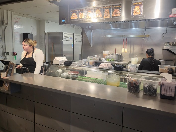 We approached the serving counter and found two employees working away. With a growing line quickly forming behind us and no time to weigh culinary decisions, we got completely flustered and fired off our order—naming the first food items that popped out from the menu and specials board.