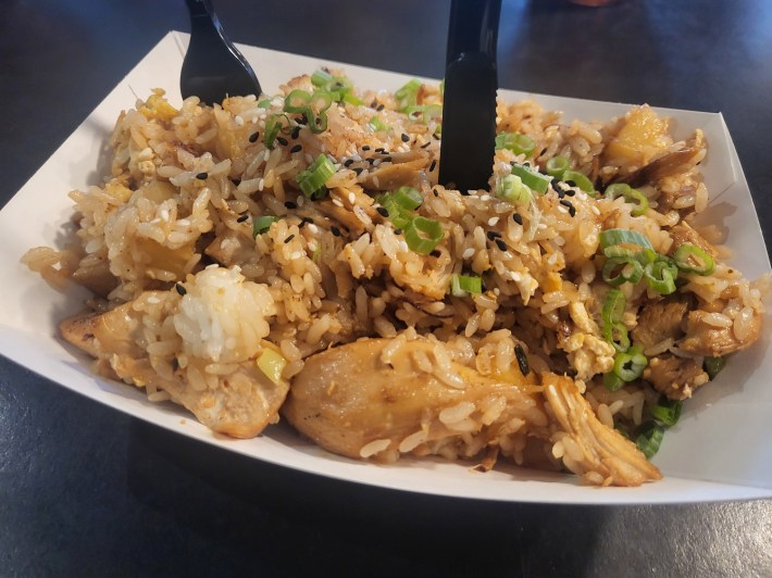 As I was munching on these serious fries, my wife dug into her island-infused entrée, the Pineapple Chicken Fried Rice ($15.00). Featuring fresh chicken, pineapple, ponzu onion, and, of course, scrambled eggy goodness, it was garnished with green onions and sesame seeds.