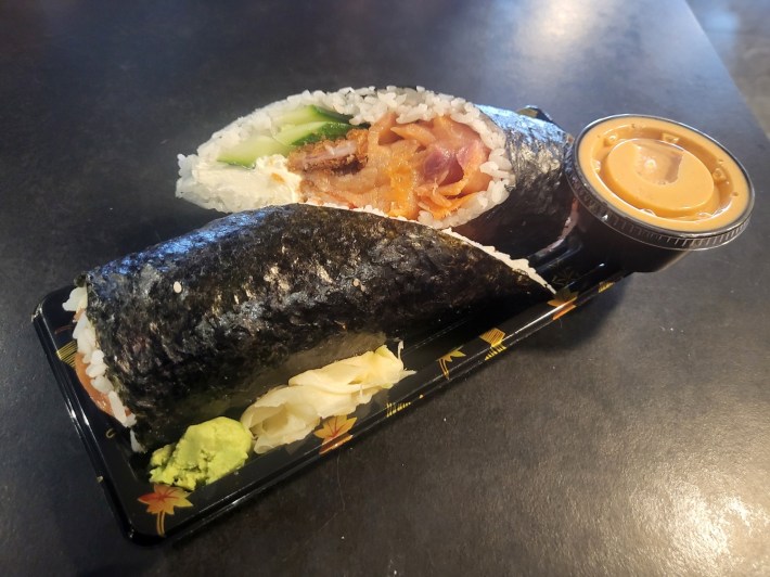 Handwritten on the erasable board on the counter, I tried the “special”—the Sushi Burrito ($15.00). In a reasonable bit of seaweed wrap, it offered tempura fried crab sticks, smoked salmon, avocado, cream cheese, and cucumber, and truly was the definition of world cuisine that I couldn’t wait to dig into.