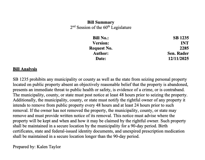 It appears Republican State Senator Dave Rader – the former head football coach of the Tulsa Golden Hurricane – has filed a bill that would help protect the rights, property and possessions of people living in homeless encampments from the surprise invasions and sweeps that Kevin Stitt unleashed with Operation S.A.F.E.