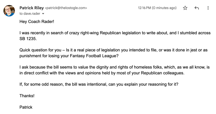 Sure, the bill still lets the state plow through homeless camps like an F5 tornado in the springtime, but since when do Republicans care about homeless folks and their possessions with even a speck of dignity and compassion? Doesn’t Rader know he’s supposed to be demonizing them instead?
