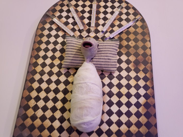 In the midst of the obligatory paintings and drawings, there were bizarre sculptures and weird dioramas that almost felt like scenes in his films, giving graphic 4-D representation of black bunny ears from Inland Empire, a recreation of the Black Lodge from Twin Peaks and, all too real, the asthmatic, mewing and surreal baby from Henry’s loins in Eraserhead.
