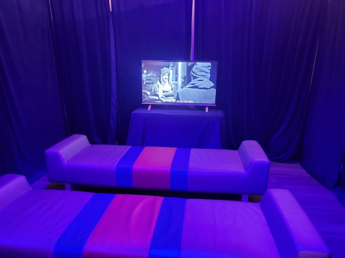 Though most of his films were visually realized—I didn’t see any Dune artwork, but I’ll let it slide—TV screens were also playing his films on rotation in front of an oddly misshapen couch. As the dark room with the moving images transfixed me, for a second, I felt Lynch’s spirit enveloped me, taking out all my Bob-rage and turning it into an angelic seraph that will heal my broken heart.