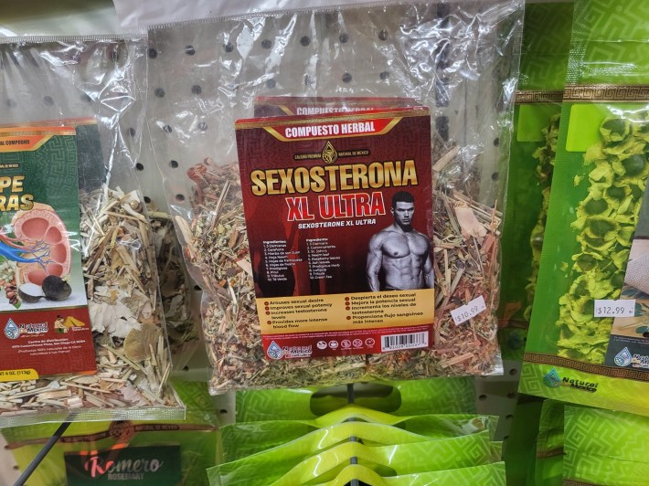 Going down the next aisle, there were many non-FDA-approved herbs that could be made into refreshing teas. Looking to improve some performance issues, ahem, I bought some Sexosterona XL Ultra, hoping it will transform me into the sexy man that any woman (and probably some men) would actually want.