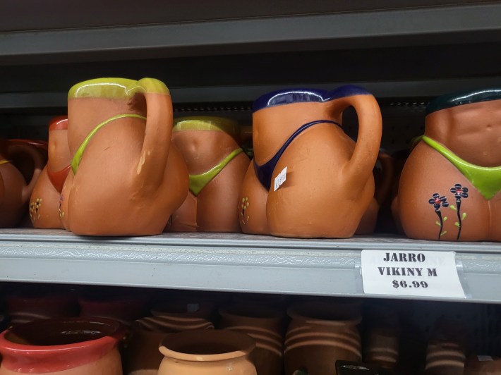 Turning the corner on the last full aisle, I came upon the most sacred of items, the Novena candles, as well as the profane, including mugs of a woman's derriere that I purchased for my wife for next Christmas.