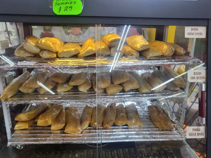 Of course, there were also bagged and fresh pan dulce, as well as fresh fruit juices, many whipped desserts, and, why not, a whole case of hot and fresh tamales—don’t mind if I do. Even though I didn’t try their wide array of tortas and other lunches, I’ll probably come back next week to sample their hot plates.