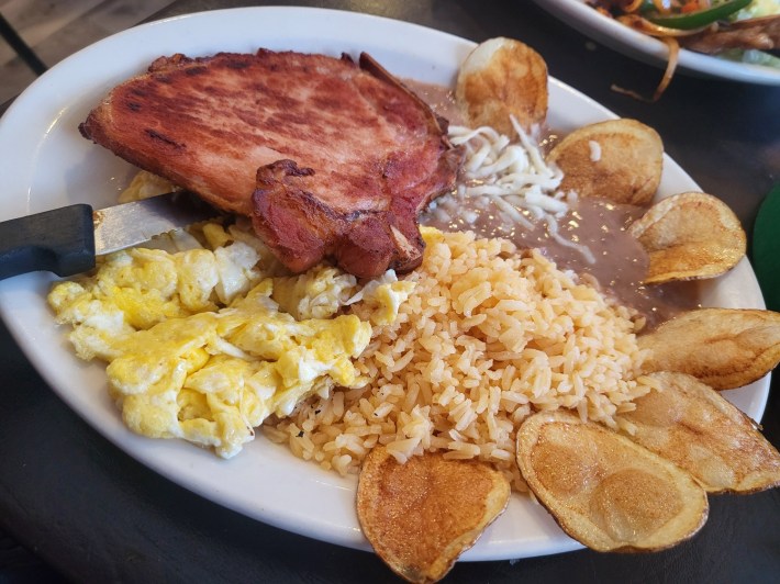 There’s nothing—and I do mean nothing—better than a pork chop for breakfast. Smoked and grilled, this was a generous cut of meat that was cooked to near perfection, and even though the eggs were just okay, the beans and rice were much more than a delicious lark.