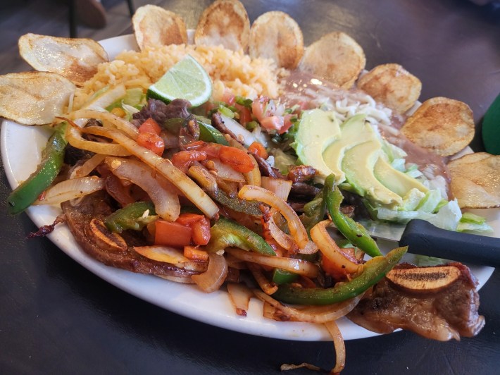 The bite-sized, tomato-infused short ribs packed a true smoky punch, and I gnawed each sliver down to a nub—nothing but bones remained. The rice and beans soaked up the grilled onions and jalapeños to delicious effect, and the whole thing came alive in my mouth. I made sure her plate was wiped clean, thanks in part to the hot, fresh, definitely homemade flour tortillas at the ready.