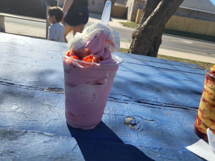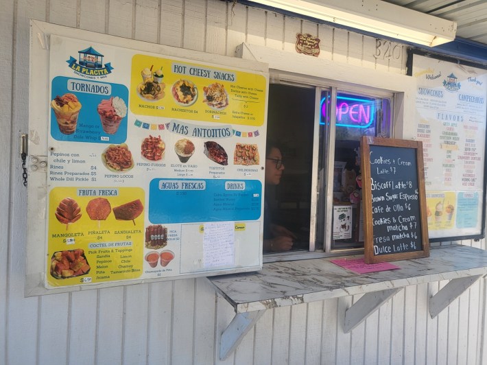 With that—after a few hours of running errands until around four o’clock—we were back at the spot, where Café Sonrisa had become the more electric La Placita Snowcones Y Mas, a seasonal stand that absolutely proves OKC has the best snack foods in the world.
