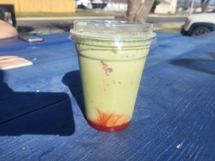 Right off the bat, the mango flavor got things going strong. Aided by fresh mango slices, Tajin seasoning, and a swirl of chamoy, this was a hot little number, with the cool ice cream melting with the seasoning, ensuring she drank it all the way down.