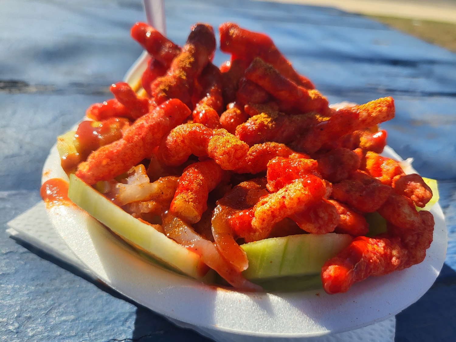 Aiming for a snack on the healthier side of life—I failed, by the way—I had the Pepino Fuegos ($6.50), a bowl of fresh sliced cucumbers and onions dowsed in hot sauce and, the piece de resistance, topped with a whole bag of Flamin’ Hot Cheetos.