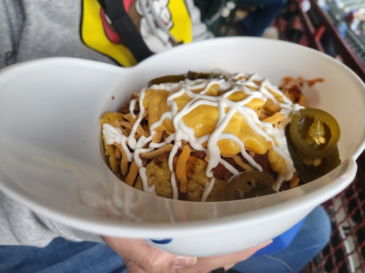 Served in a large replica of a Comets helmet, though definitely filling and undeniably tasty, it felt like it was too much—the tortilla chips were weighed down by the toppings, causing floppy chips and clumpy cheese by the third inning.
