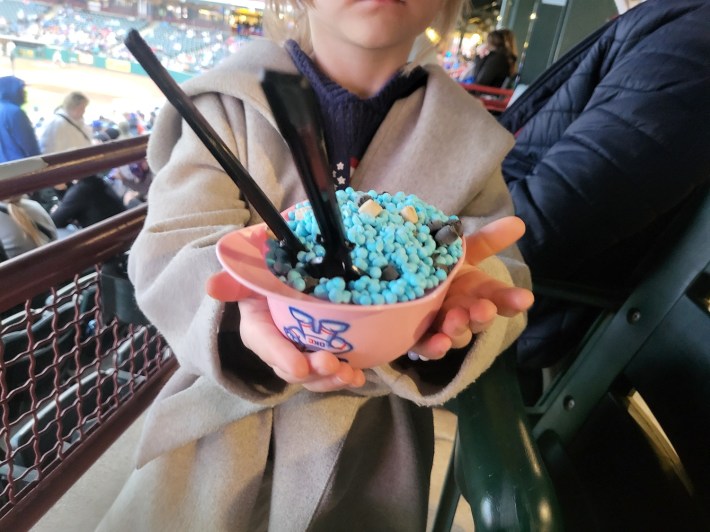 We walked to the stand-alone cart bearing the ice cream of the future, and she got the Cookie Monster ($8.99) variety—served in a pink collectible baseball cup, much like the nachos. And while I gave them a pass, my niece loved the Dots, so I called it a line drive.