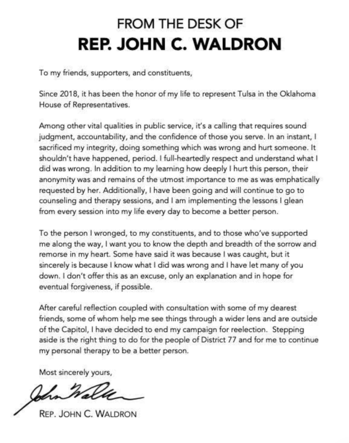 “I was under enormous personal stress. I made a mistake, which I instantly regretted. I’ve accepted every consequence that was asked of me, and I’ve done a lot of personal work. I’m still deeply regretful for making that decision,” Waldron (D-Tulsa) said Thursday. “I had a bad day. That’s what happened.”