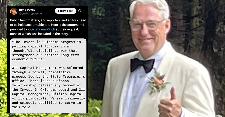 Anyway, just like Governor Stitt, Bond was apparently not very appreciative of the Oklahoma Watch report that, pretty convincingly, detailed how he and Stitt did not reveal or disclose their personal and business relationships when it came time for a board to vote to give Payne’s firm a role tied to a potential $2 billion state investment fund.