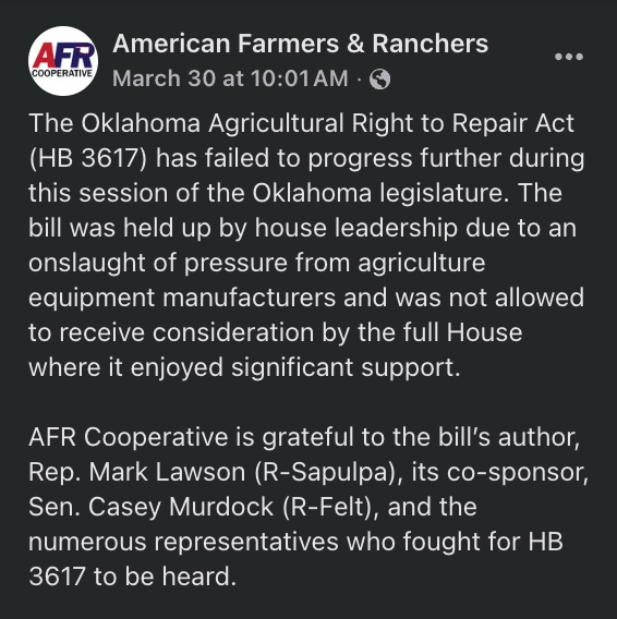 Yep that’s right. Nothing says “Oklahoma values” like lawmakers protecting a multinational equipment company’s repair monopoly over the people actually working the land. It sure is a shame to see farmers get exactly who and what they vote for, huh?