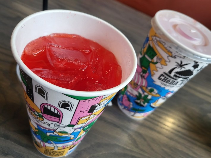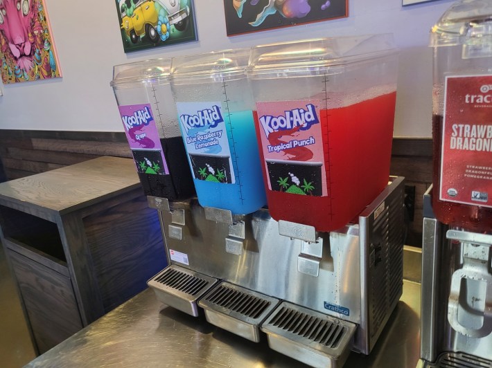 Now, I got to say, Cheeba Hut is on point with their Kool-Aid selections, which on that day included Grape, Blue Raspberry Lemonade, and my own perennial favorite, Tropical Fruit Punch. We filled our cups with mostly sugared-water and sat down with our table-top character, Gandolf, to help our order find us.