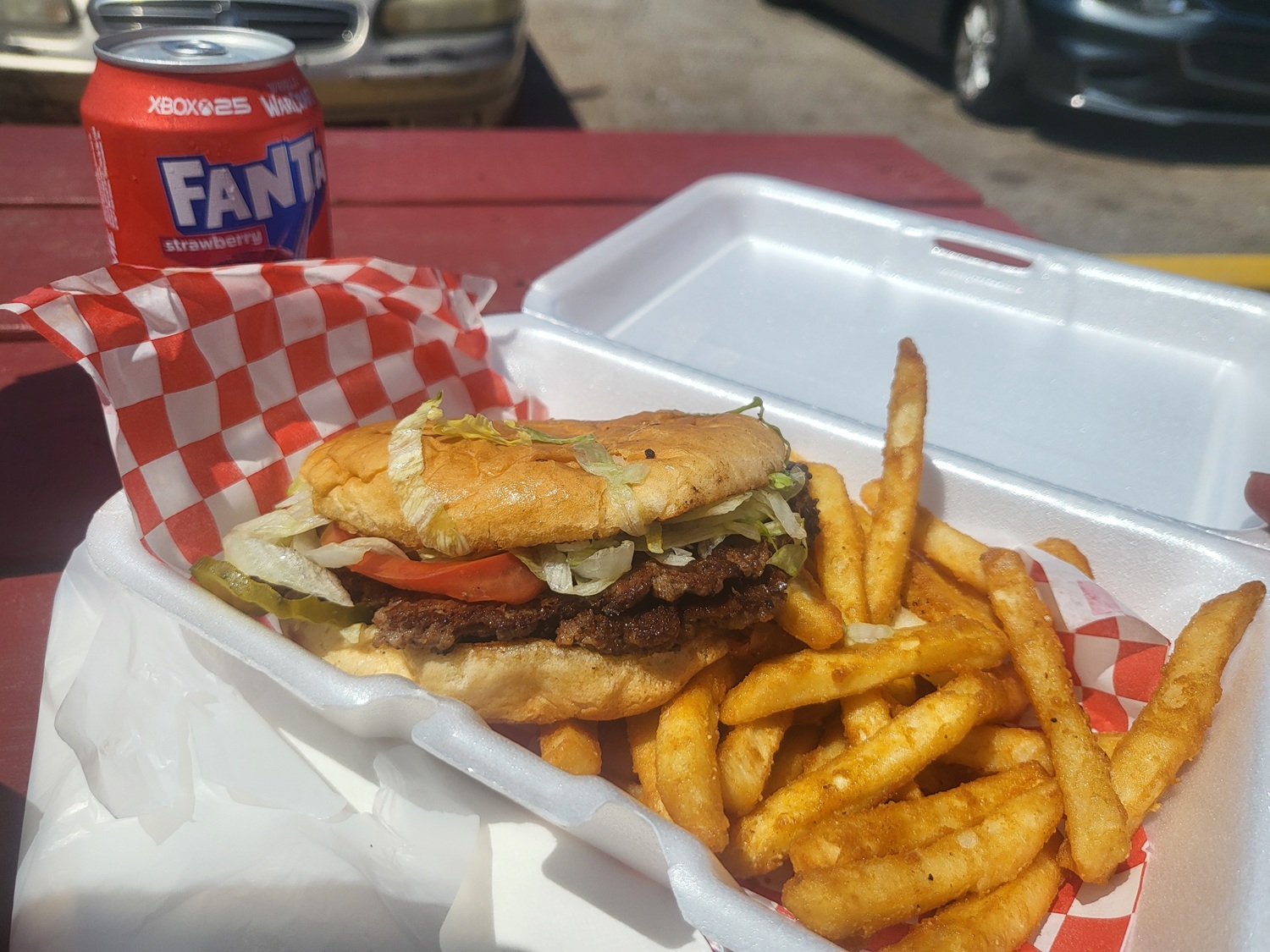 While she was enraptured with her burger, I tore into mine—the combo special—which included the Double Up with Cheese ($7.50), regular fries ($2.75), and a can of Fanta soda.