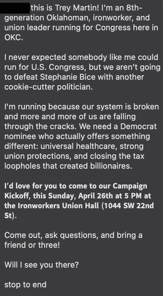 Earlier this month, Trey Martin – a hard-workin’, union-lovin’, blue-collarin', tattooed man-bro from the Edmond–Guthrie badlands of Logan County – officially announced he will run against Jena Nelson in the Democratic primary for CD-5 on June 16.